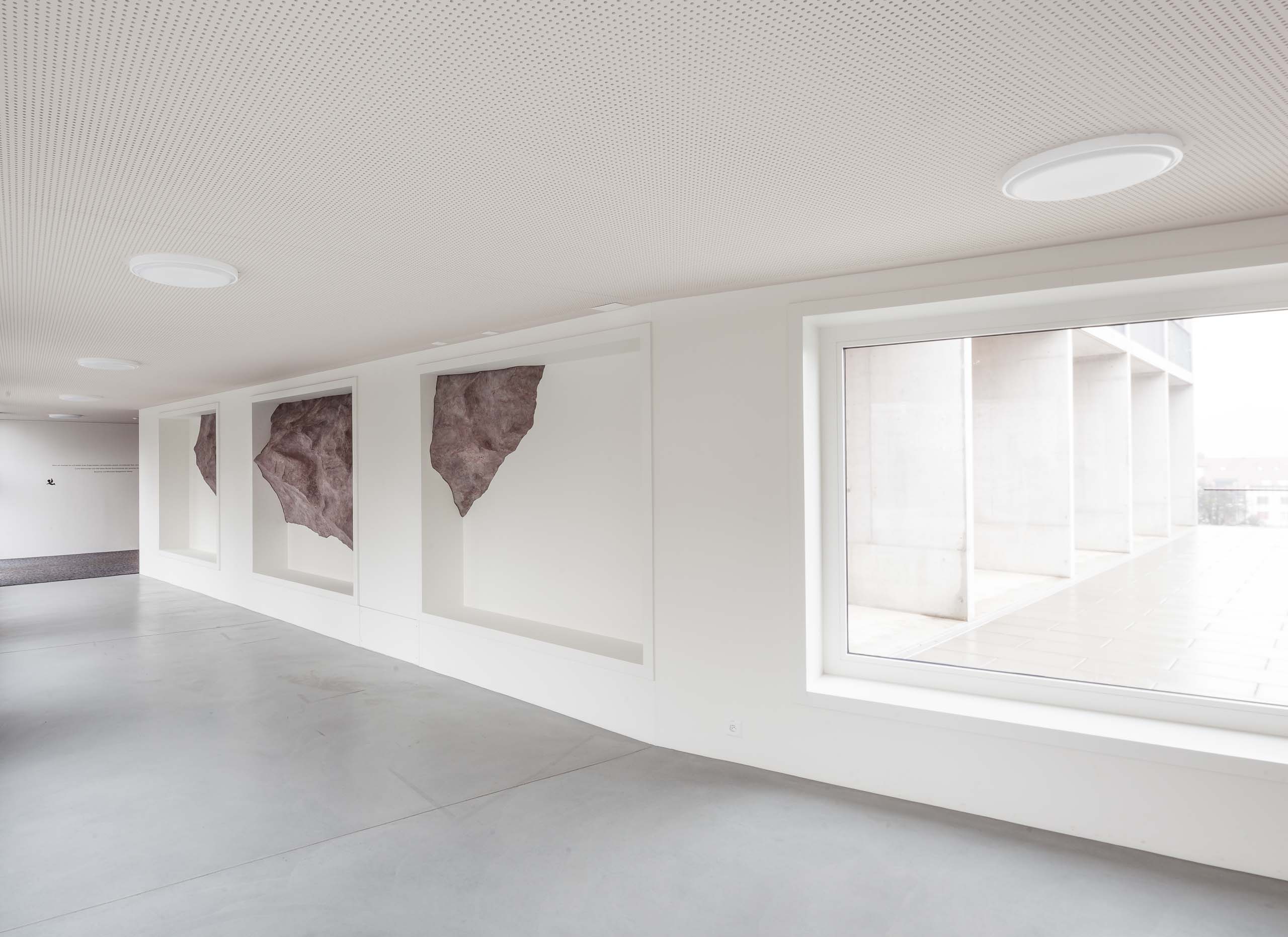 Besonders bei öffentlichen Bauten werden hin und wieder ein Teil der Bausumme für Kunst am Bau budgetiert. Nicht immer kann und soll diese Kunst bei Bauübergabe fertig installiert sein, sondern wird gerne mit einer nachträglichen Vernissage zusammen mit dem anwesenden Künstler bzw. der Künstlerin gefeiert. Danach kommt der Fotograf. In diesem Beispiel unterstützt das Licht des trüben Februartages die farblose Architektur und zeichnet sanft die Formen der drei Nischen mit dem Kunstfelsen in seinem dezenten Magenta des lokaltypischen Verrucano-Gesteins.